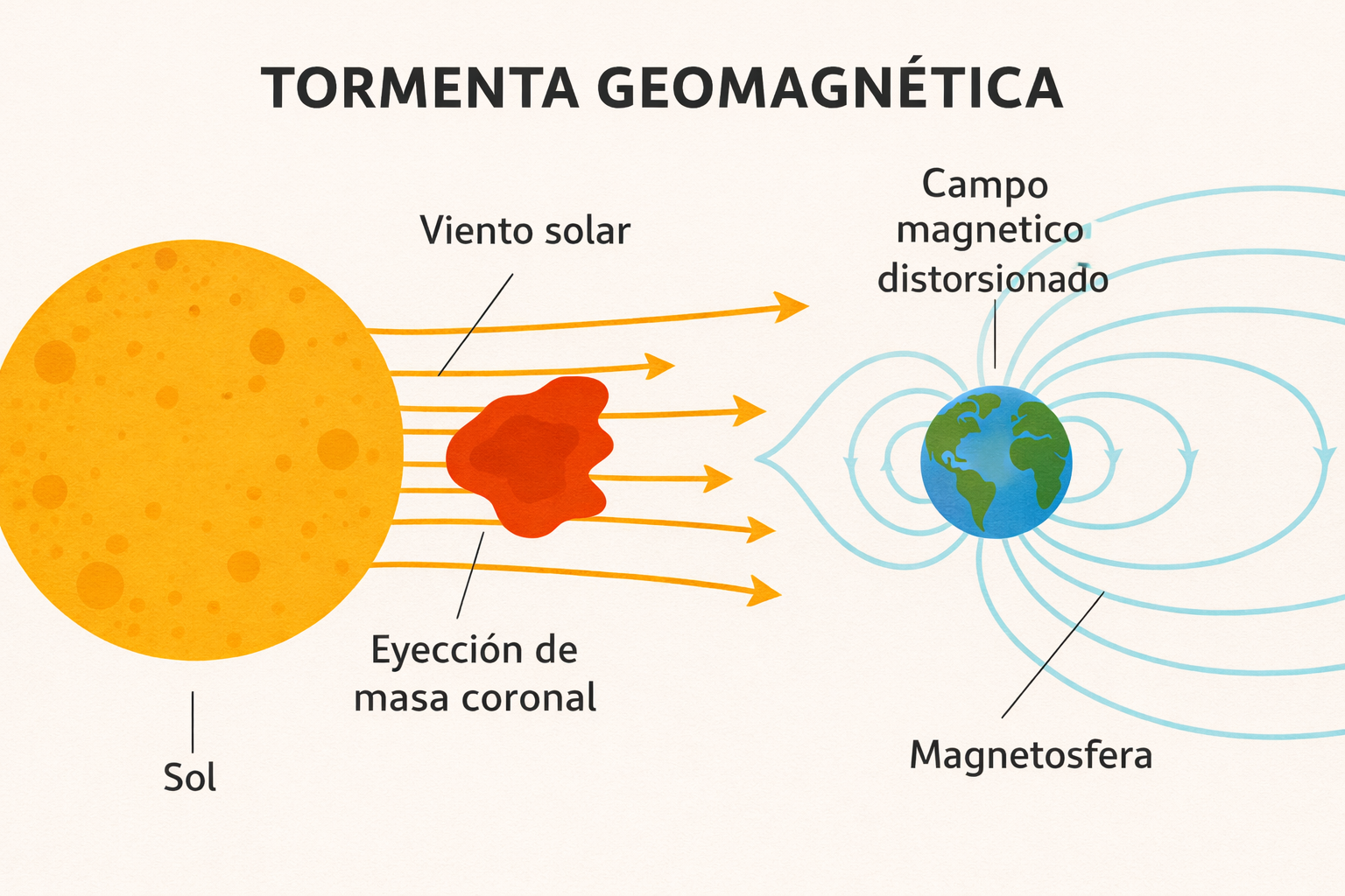 Las tormentas geomagnéticas ocurren cuando grandes cantidades de partículas solares alcanzan la magnetosfera terrestre, alterando el campo magnético. Solo cuando la actividad solar es muy intensa (con índices geomagnéticos Kp altos) la aurora puede verse en latitudes medias, como España